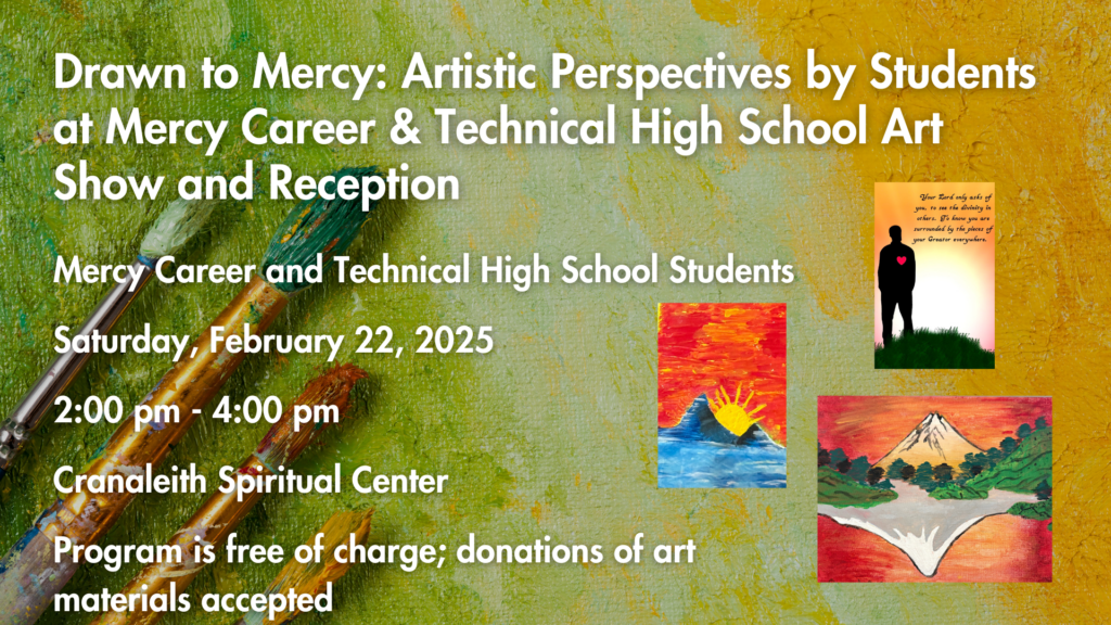 Join us as students from Mercy Career and Technical High School proudly showcase their artwork in this unique exhibit. In the exhibit, you will find works of art that reflect the Critical Concerns of the Sisters of Mercy for the Earth, Women, Immigration, Racism and Nonviolence, as well as beautiful works depicting what is on the minds and hearts of the students. These students created these pieces either during Art Club, for a school project, or on their own time.