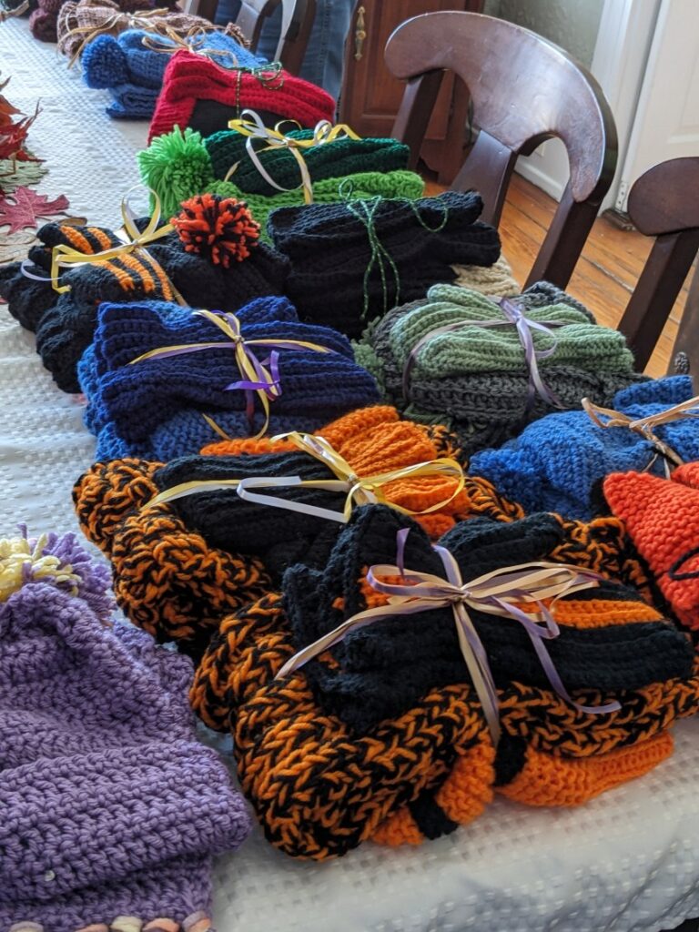 We love to crochet and knit; and we motivate and inspire each other and share our stories. We start each meeting with a reflection on a spiritual reading. Along with honing our creative skills and deepening our spiritual growth, our mission is to care for people living in all forms of poverty through our crocheting and knitting. For women and children living in poverty a handmade item is not just a hat or scarf or a blanket, but it’s protection, warmth and a promise of support for a better future. We collaborate with like-minded organizations such as homeless shelters, immigration centers, transitional housing centers, and Beds for Kids.