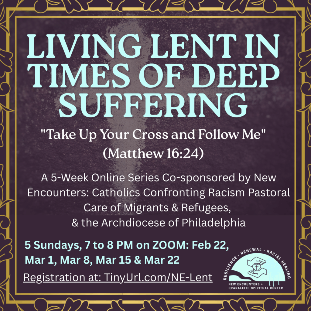 *IMPORTANT: You will be sent to a trusted registration form hosted by Cranaleith Spiritual Center’s partner, New Encounters: Catholics Confronting Racism. Please contact Dr. Mary Laver at 610.324.9388 or NewEncountersCatholics@gmail.com with questions regarding this program.