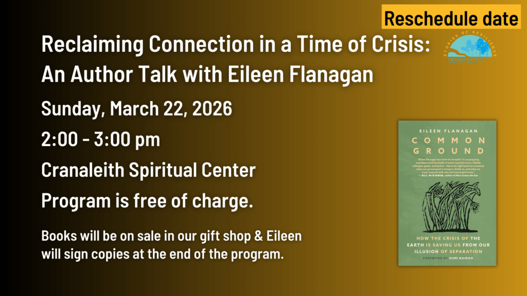 Eileen Flanagan’s book, Common Ground: How the Crisis of the Earth is Saving Us from our Illusion of Separation, will be on sale in Cranaleith’s gift shop and she will sign copies after the program.
